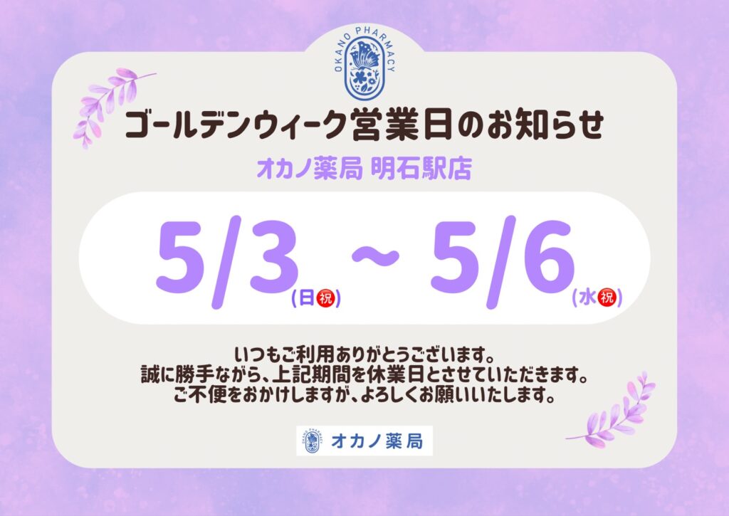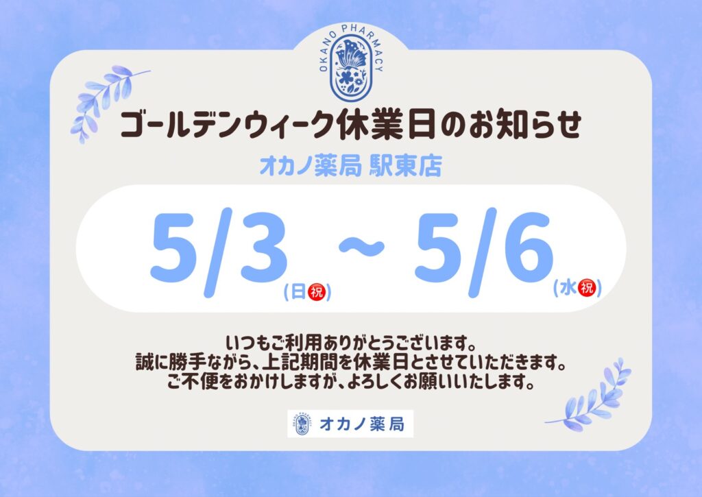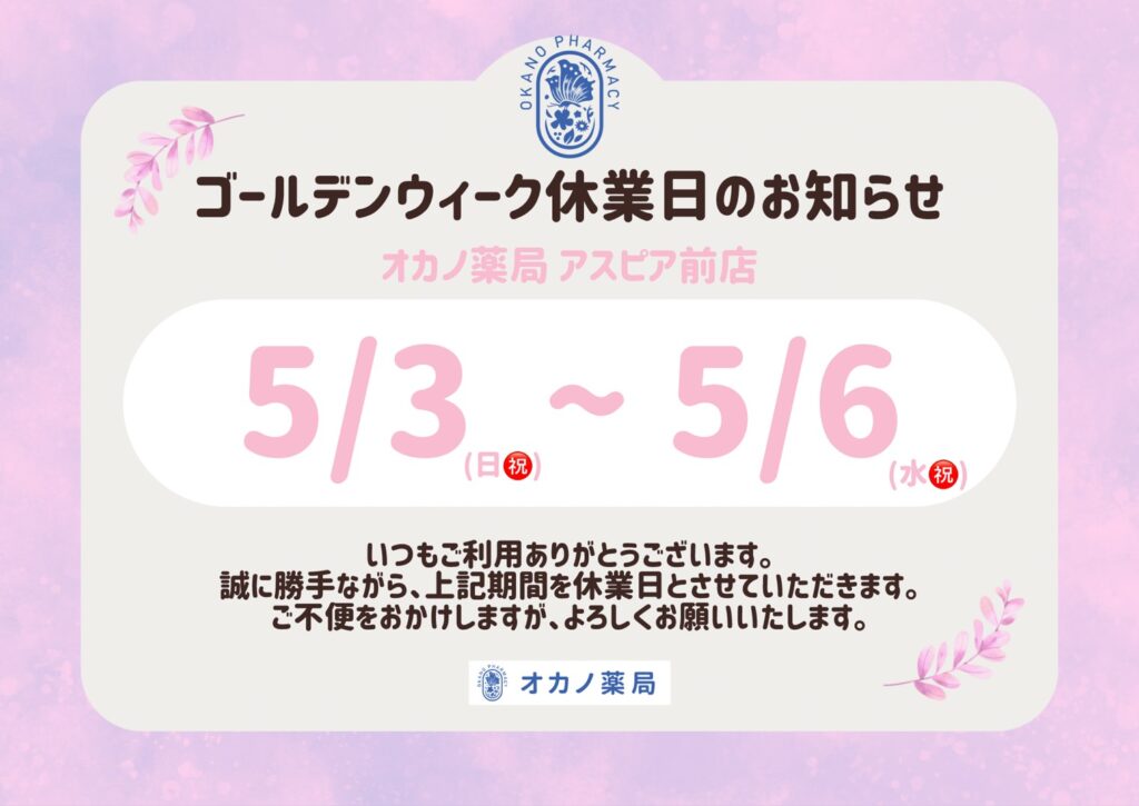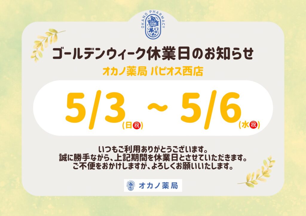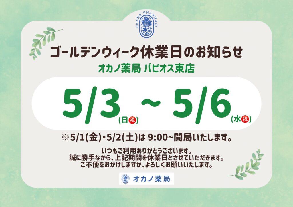いつもオカノ薬局をご利用いただき、ありがとうございます。ゴールデンウイークの営業日についてお知らせします。各店舗、開局時間や開局日が異なりますので、ご確認ください。