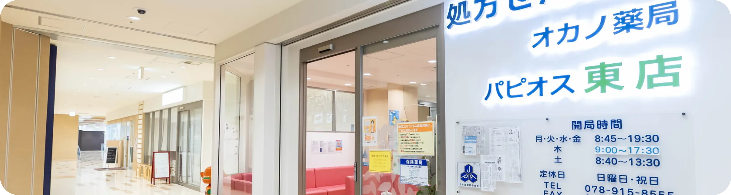 明石駅前のパピオスあかしの3階に2017年に開局した、オカノ薬局の中心的な店舗です。